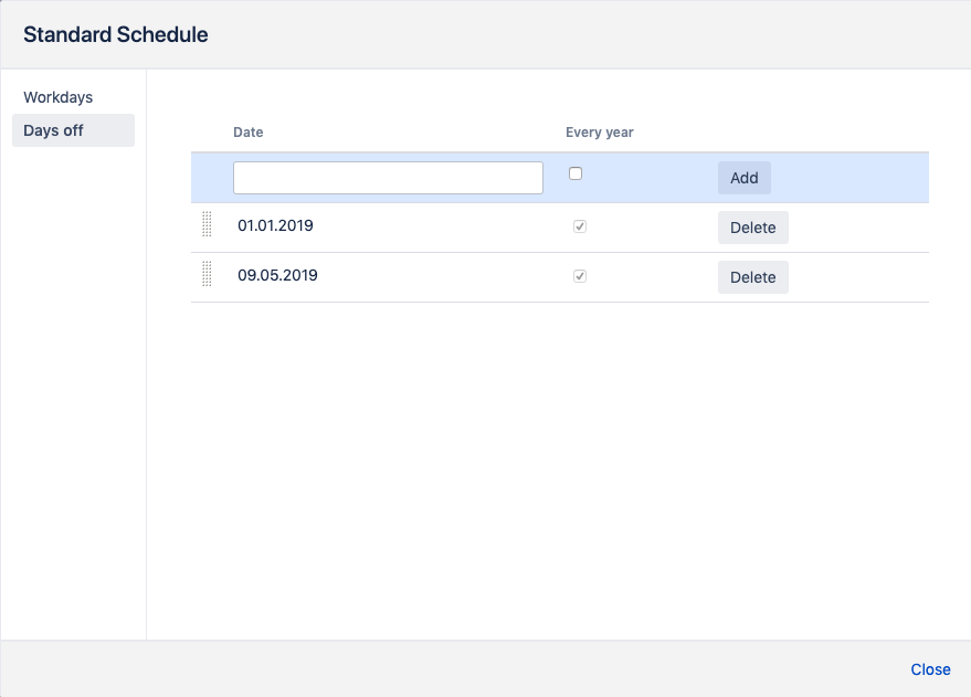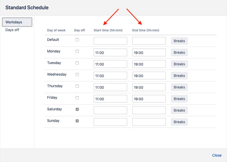 Work calendars are basically the work schedules the users must be available on depending on different parameters combinations. You can create as many calendars as required. If no specific calendars added, the app supposes the default calendar is 24/7 with no days off and holidays.