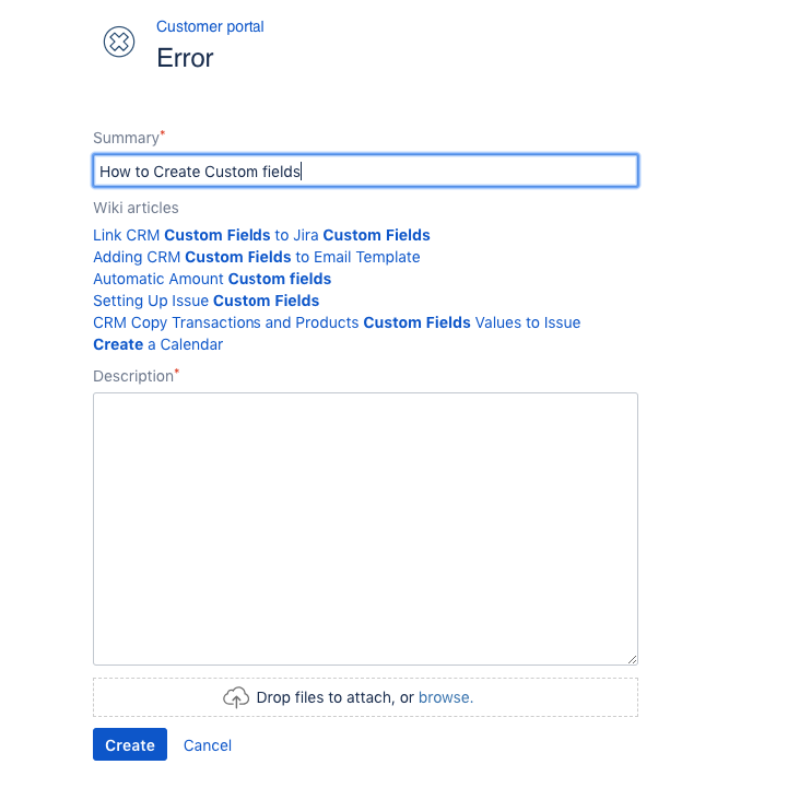 Not only the customers will be able to browse the list of relevant articles while creating a request at the Customer Portal, but the internal Jira users will also be able to do that while creating a new issue in a standard way.
