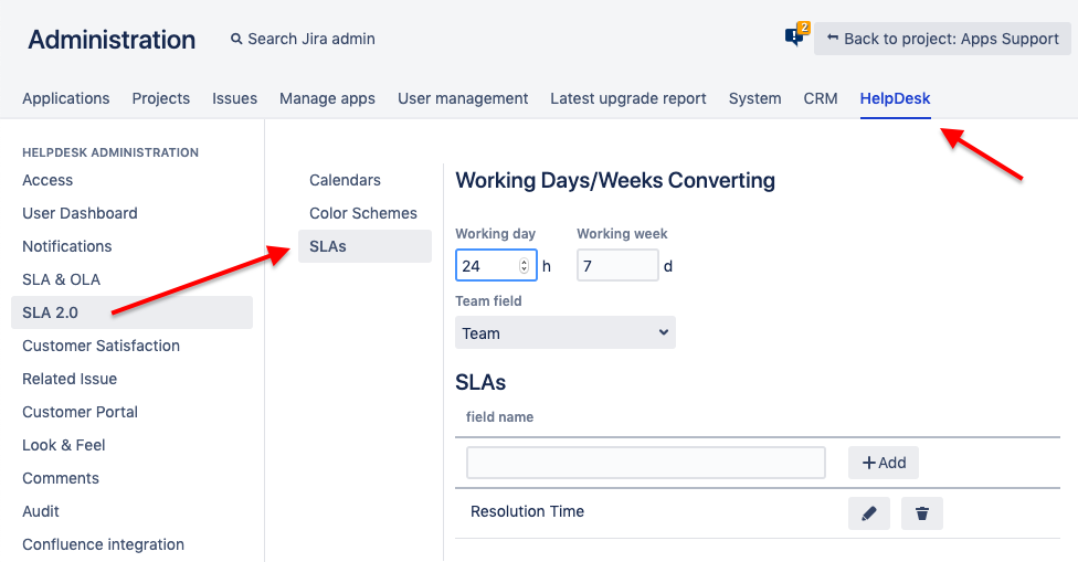 Specify the Working Days/Weeks Converting rules. The SLA goal hours will be converted to days and weeks according to these rules. For example, if you select the working day = 8h, the 10h SLA goal will be displayed as 1d 2h. If you prefer to count the time in the calendar days/weeks, leave the default 24/7 setting.
