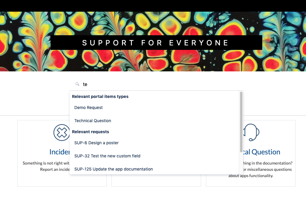 for the portal request types – searching by the request name and description within all request types available for the current user;