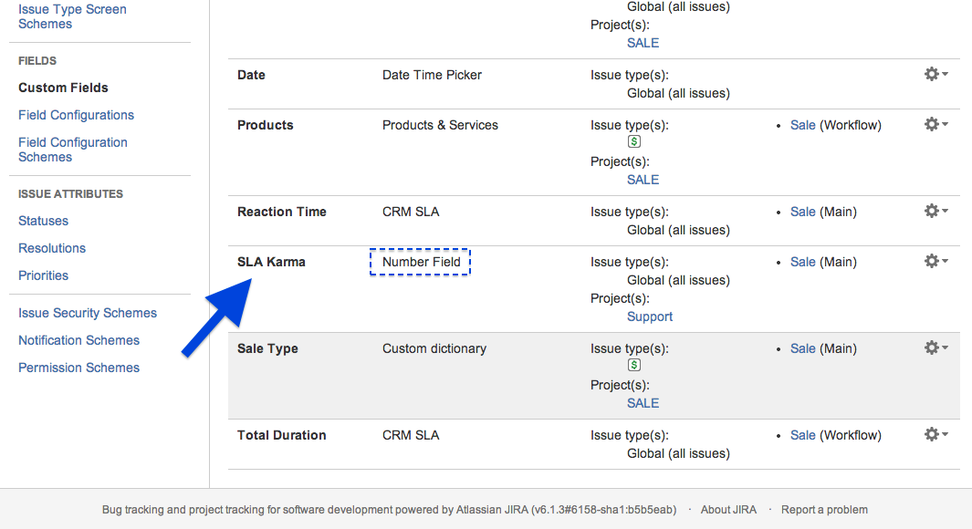 To use SLA Karma we should add a new custom field to Issue Screens. Go to the Administration > CustomFields and add field (type Number):