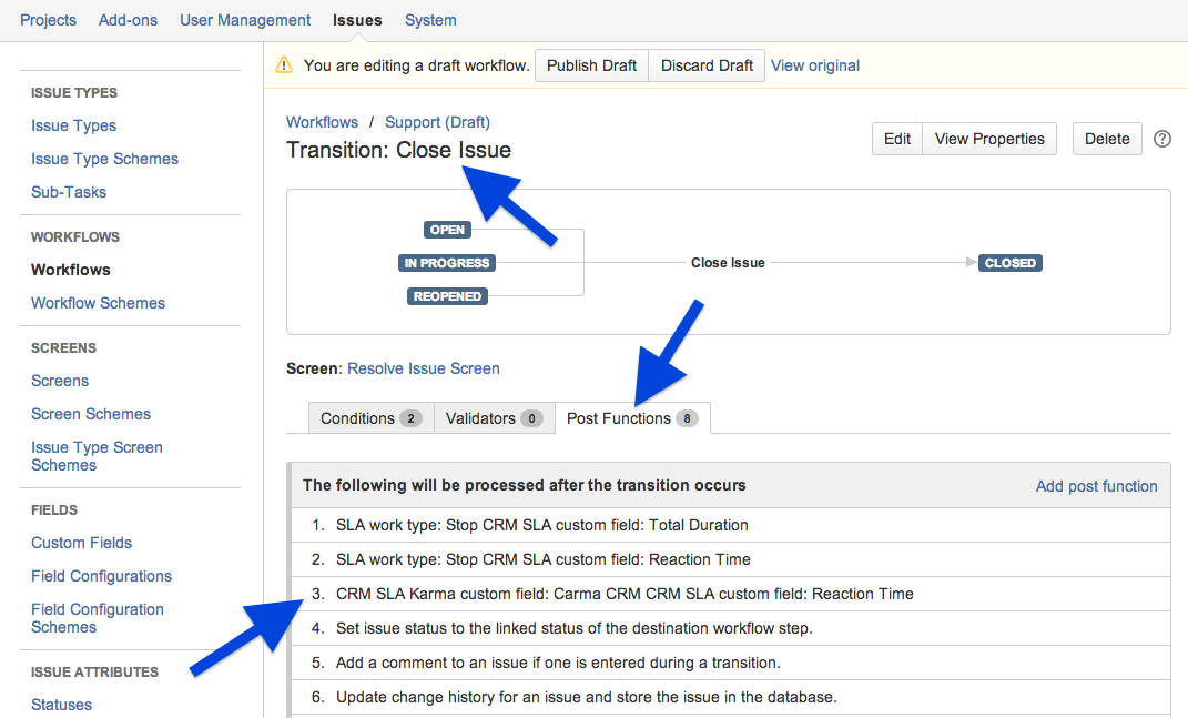 With SLA Karma we could control SLA violations by assignees. HelpDesk stores SLA Karma in the issue field (type Number). HelpDesk check violation of SLA if the assignee closes the issue (or resolves it). If there is a violation of SLA, HelpDesk stores negative points to the SLA Karma field. If there is no violation of SLA, HelpDesk stores positive points to the SLA Karma field. So, during working with issue assignees could increase or decrease points. We could track if an issue will has a negative SLA Karma value.