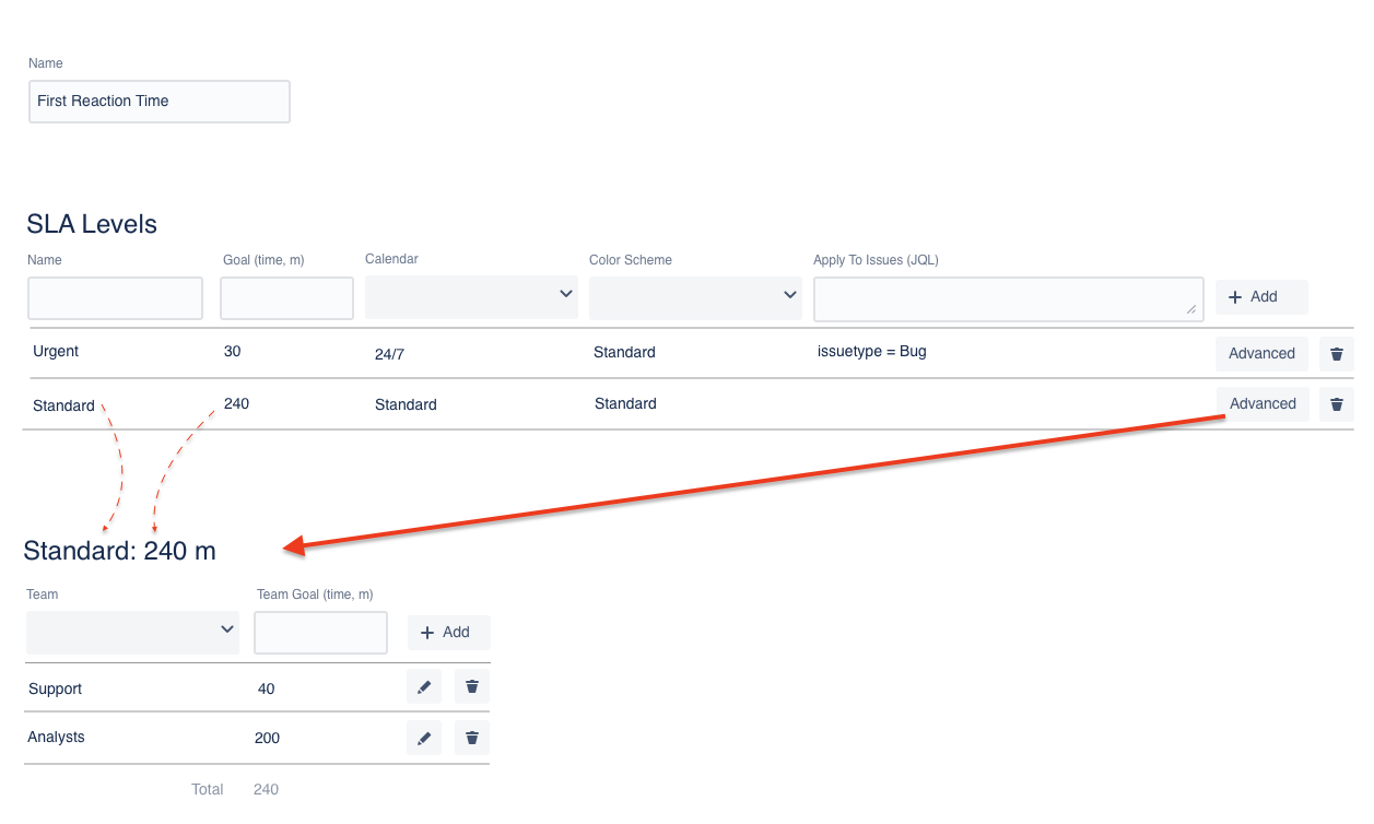2. Navigate to the particular SLA and set up the Advanced settings for it. Distribute the overall SLA time between your teams (teams are the options from the field selected as the Team field).