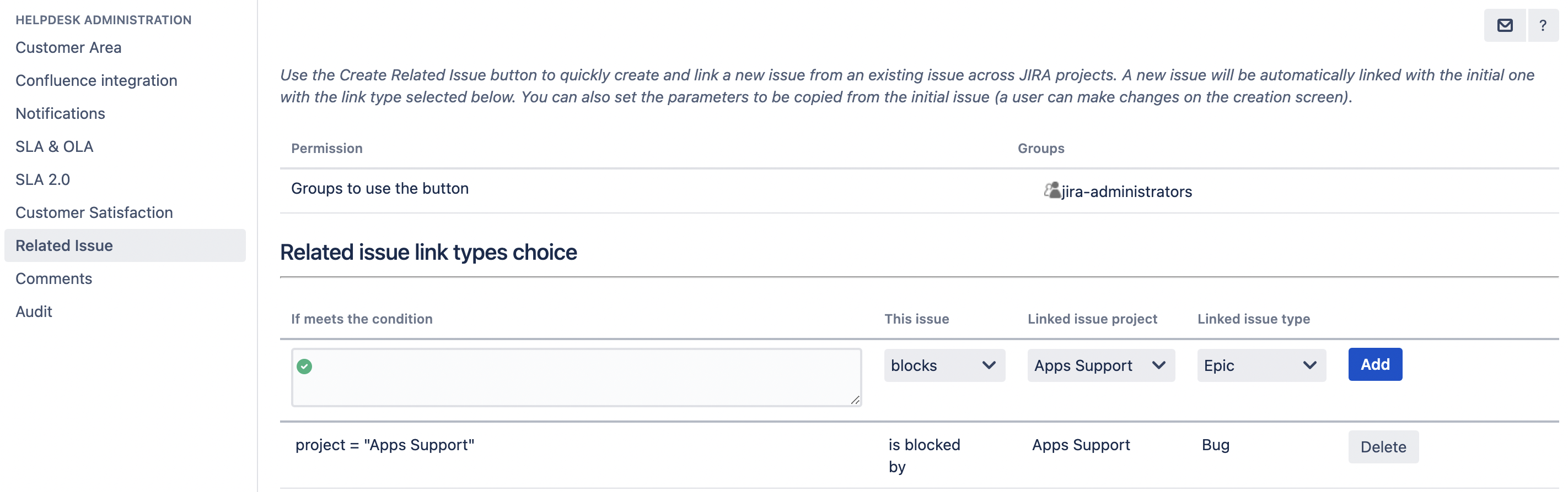 On the example below, only jira-administrators will see the Create related issue button. In case of creating a bug from an issue in the Apps Support project, the initial issue will be marked as blocked by this bug.