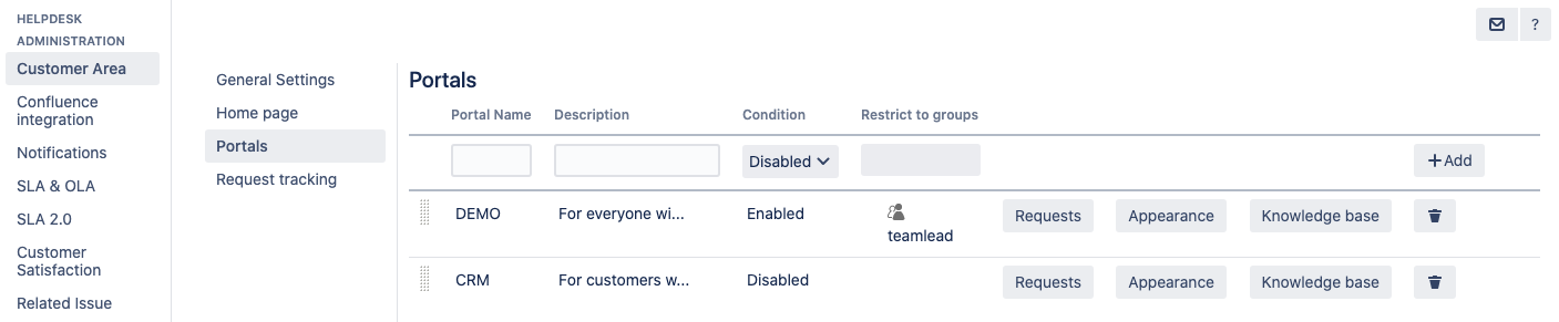 The portal settings are located at HelpDesk Administration → Customer Area → Portals: