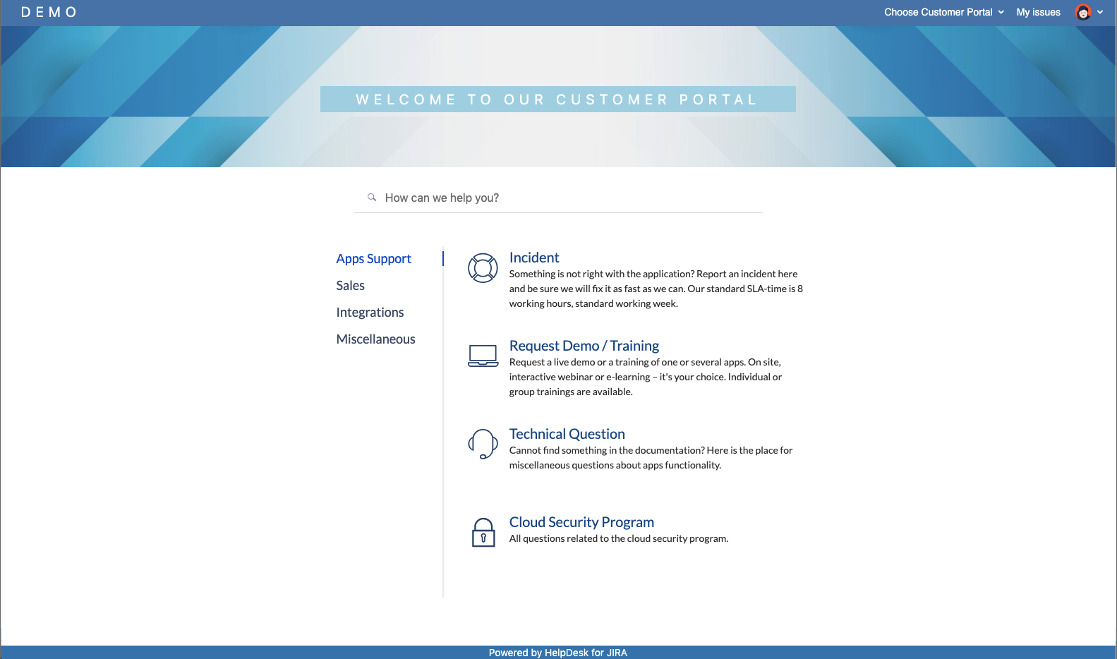 Customer Portal is a place where your customers can create requests that will be available for agents as regular Jira issues. HelpDesk provides the ability to create one or more customer portals – project-related or cross-project ones – and brand them in different ways. A portal can be restricted to groups of users.