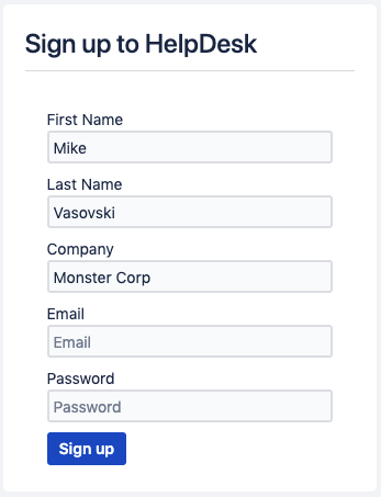 Don't request a company name on the signup form | While allowing public signup you'd probably want to know what company a new user works in. Of course, it wouldn't be secure to allow your customers to specify their organizations (if you use the CRM integration), still, you'd like to know some information about them to clarify. HelpDesk allows you to ask the company information at the authorization screen. This information won't lead to any changes in your CRM, it will just attach this information to the user full name: ![]() ![]() |