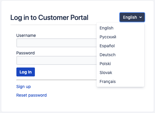 A user will see their profile-relevant language translations on the Portal if this translation is available. If it's not – a user will see the original entity name. The language can be selected at the login window as well as in profile settings. By default, your customers will have the default system language in their profile.
