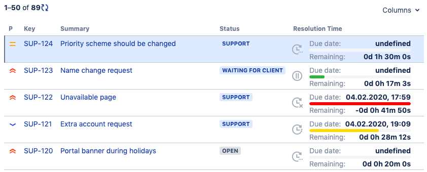 In one case you can see the due date as UNDEFINED. That means the SLA countdown is paused and the time of unpausing is unknown. For example, you are waiting for fo the information from a customer. As soon as the field countdown started, the due date will be shown.