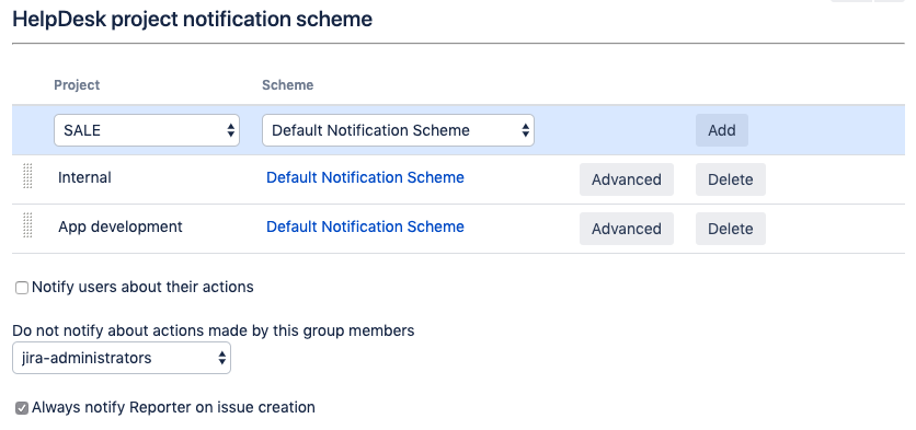 Here you can set up the HelpDesk notification scheme for each required project. For each entry specify: