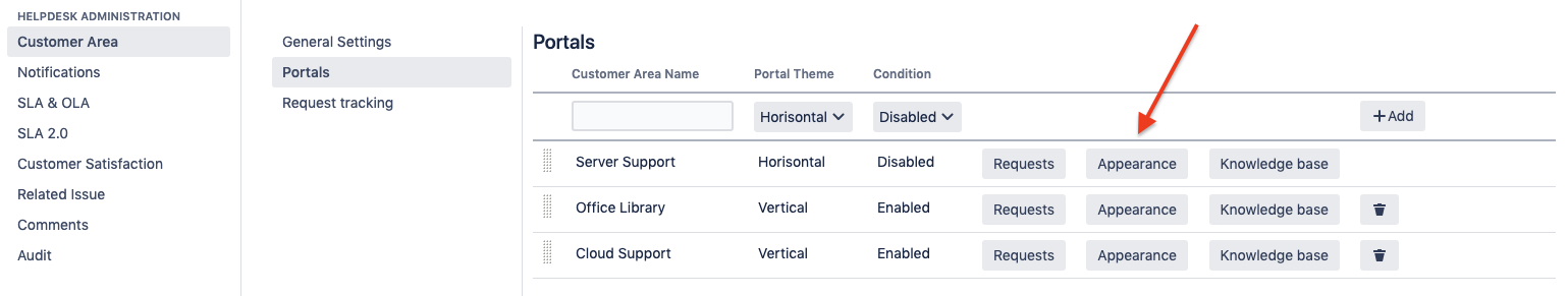 Navigate to HelpDesk Settings → Customer Area → Portals → portal → Appearance
