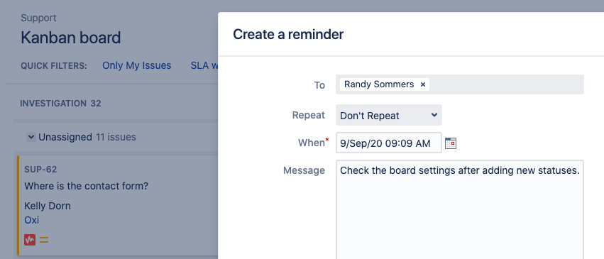 Do you know that you can create a reminder not only for an issue but also for any Jia page? It might be useful if you need to control the settings page or another Jira app entity.