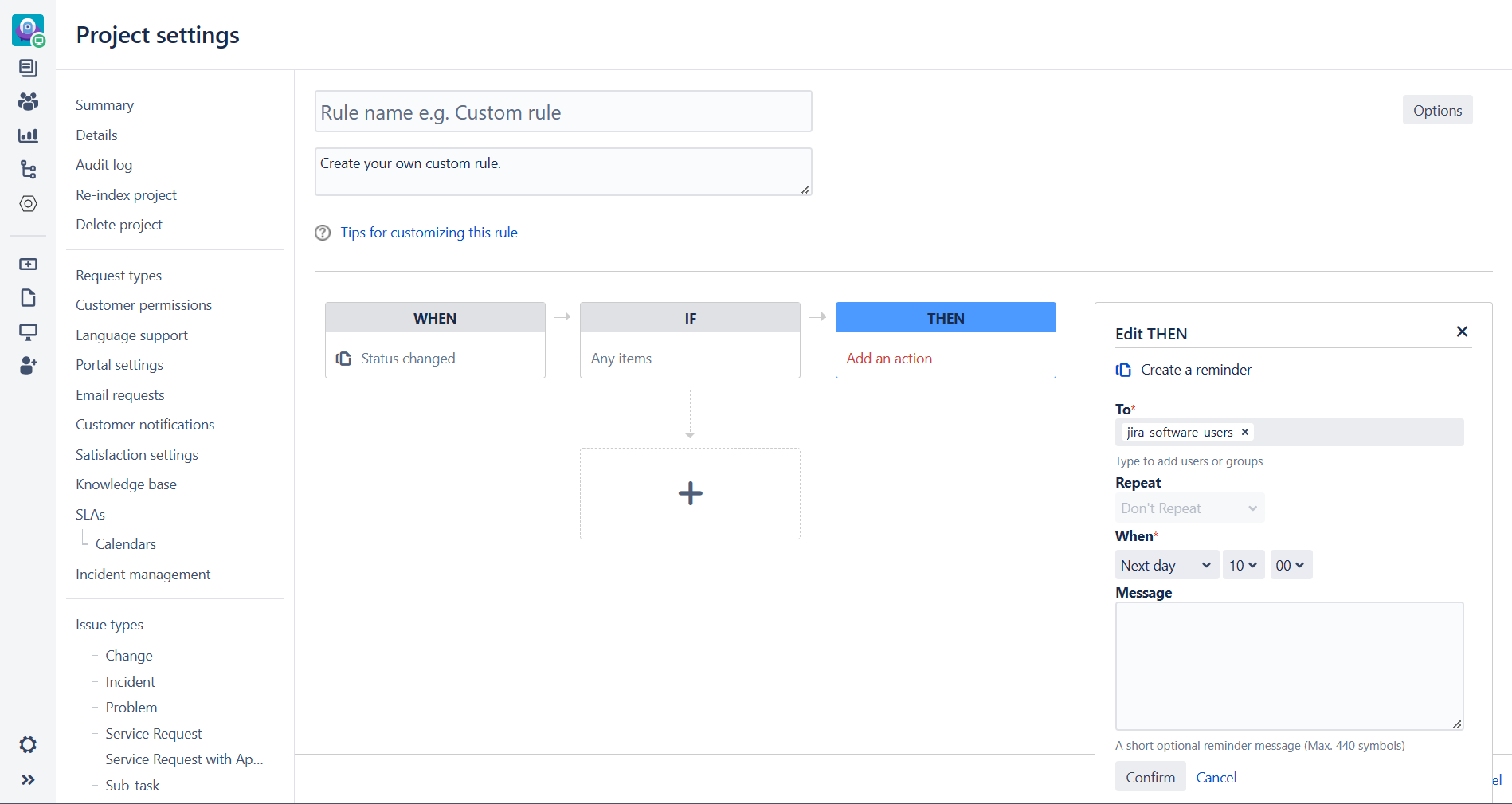 Actions are the doers of your rule. They allow you to automate tasks and make changes within your site, and can perform many tasks, such as editing an issue, sending a notification, or creating sub-tasks.