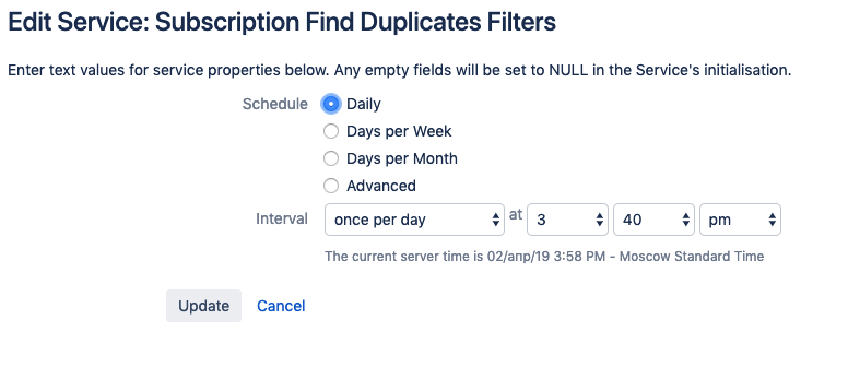 The default timer settings are: once a day at 1 a.m. (server time). We recommend using the service during the minimal Jira using time (i. e. at night) since the service might be heavy in case you have too many filters in Jira.