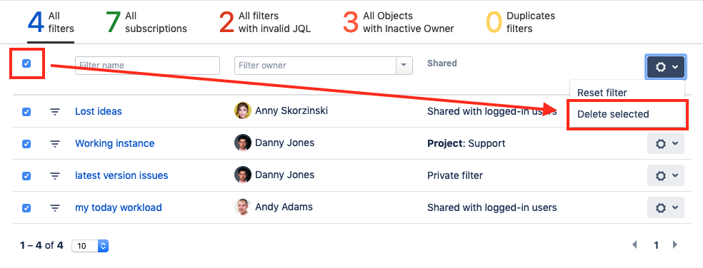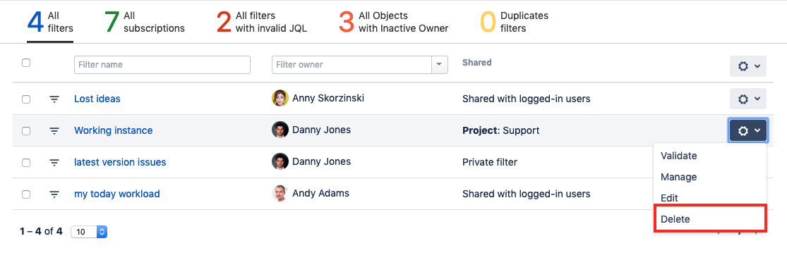 The app provides a user ability to perform different actions to your filters subscriptions. If you are going to delete or manage your filters ensure the users subscribed to them were acknowledged in advance. Each tab (excluding the Duplicates filters one) allows user to perform the different kind of actions to the tab entries.