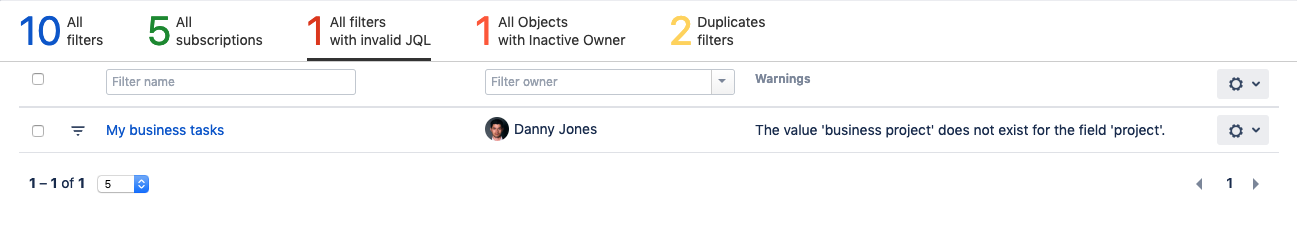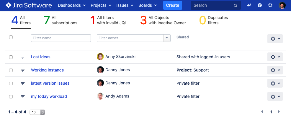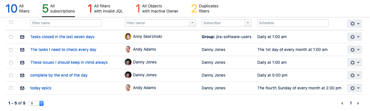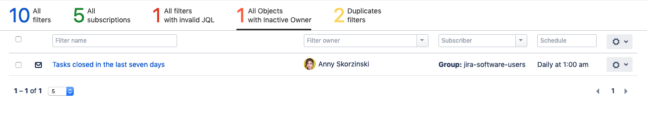 The tab contains the list of your subscriptions on those filters, whose owners don't have access to Jira anymore. The following information is available for each entry: