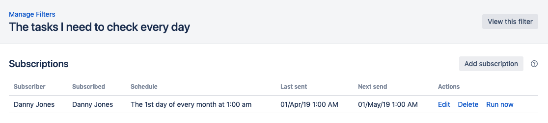 The tab contains the list of your subscriptions on those filters, whose owners don't have access to Jira anymore. The following information is available for each entry:
