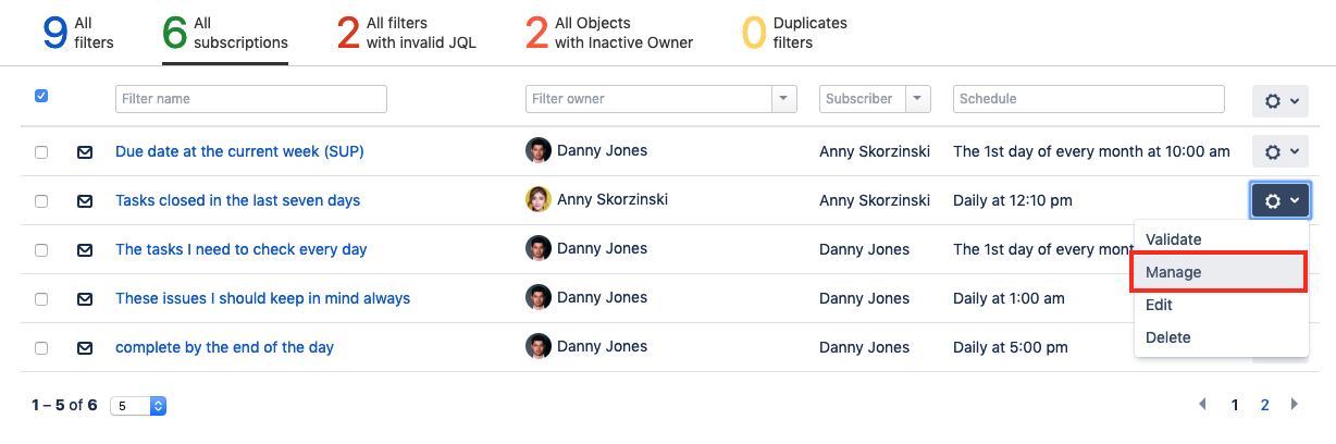 The app provides a user ability to perform different actions to your filters subscriptions. If you are going to delete or manage your filters ensure the users subscribed to them were acknowledged in advance. Each tab (excluding the Duplicates filters one) allows user to perform the different kind of actions to the tab entries.