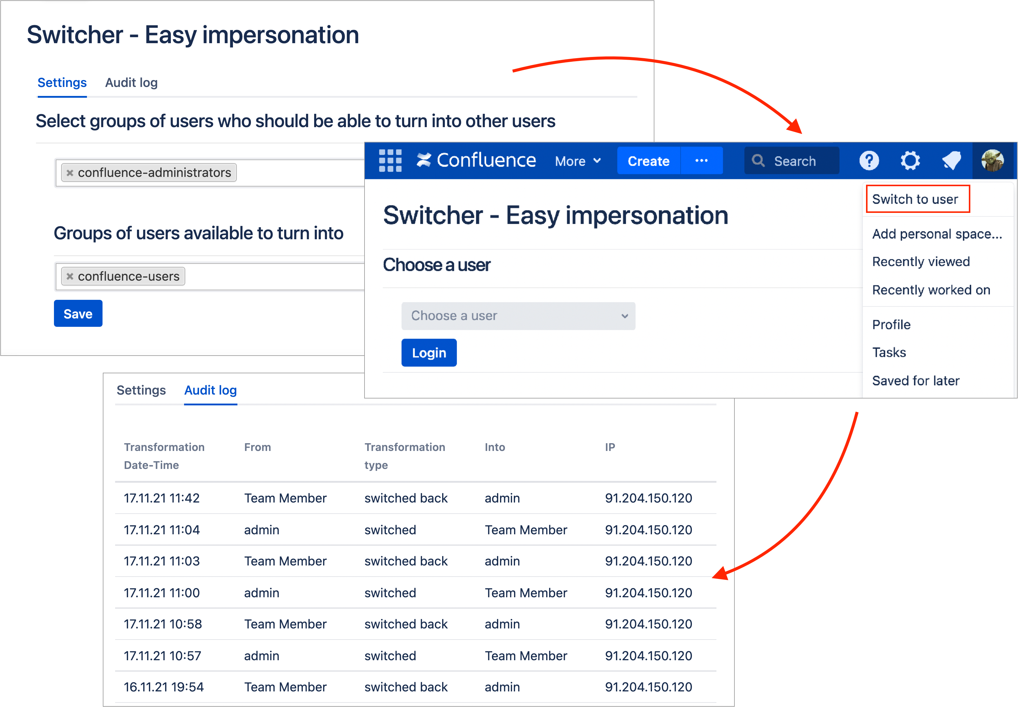 Switcher for Confluence is an app that allows a Confluence user to act on behalf of another user (the audit log provided) without knowledge of their password. Give the ability to any group of users to transform. Define the groups of users that should be available for transform into. Never be unsure anymore.