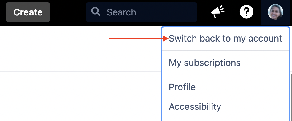 Don't forget to switch back when finished – just navigate to the profile picture and select the Switch back to my account option in the drop-down menu. In case you log out of Jira, you will be switched back to your account automatically.
