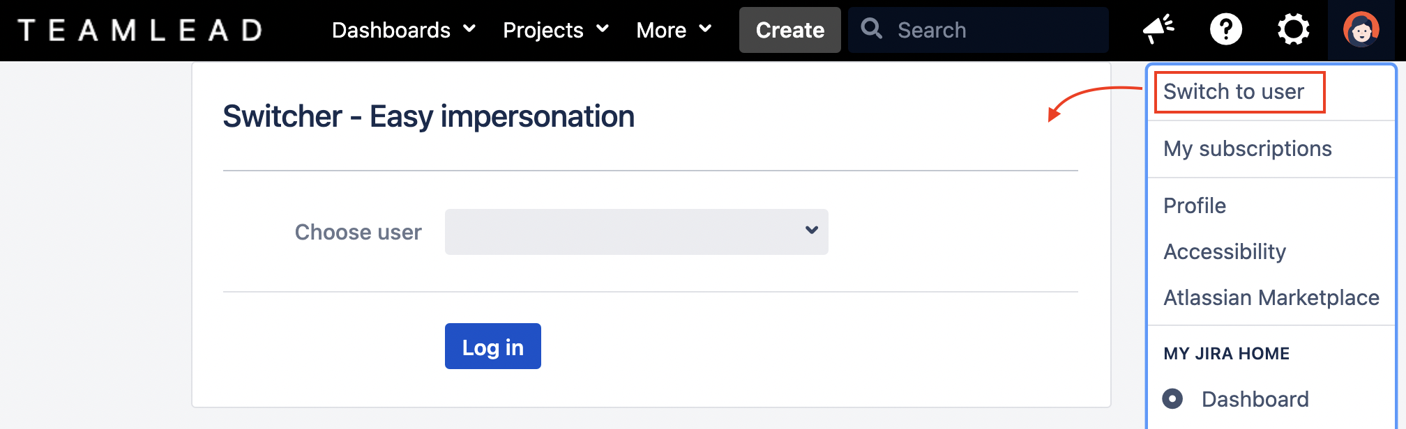 If your Jira Admin granted you rights to use the Switcher for Jira app, you can find the relevant section in your profile menu and can behalf of another user. Navigate to the Switcher settings, select a user and push Login – now you are able to perform the actions in the system on behalf of the user you selected. You won't be able to find any user in the list of options – only those who have been included in the list of users available to turn into (specified within the Switcher Settings).