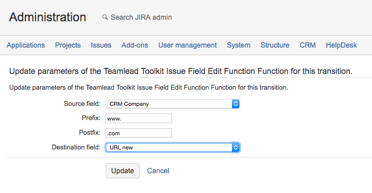 The function allows to concatenate some custom field value and add to it postfix and prefix and store the result to the text type custom field.