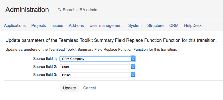 Select issue fields (from 1 to 3) to be concatenated and input to Issue's Summary. If the post-function is set to creation transition then make sure it is after Issue Creating functions.