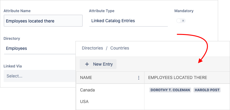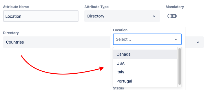 Step 1. Define the object (i.e. Employee) and add a Directory attribute to its template. Name it (i.e. Location) and select a directory as a target one for fetching options from (Countries). Your employee template now allows user to select locations from the list of countries.