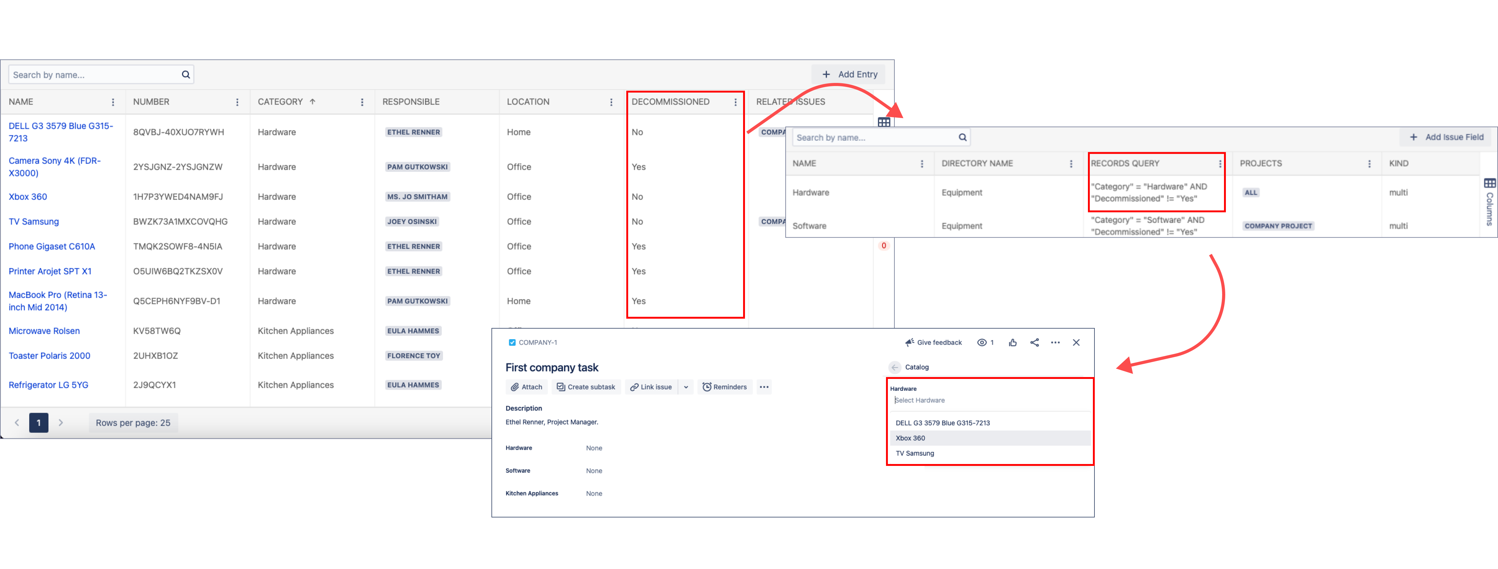 issue fields: add a relevant query in Records Query field ("Category" = "Hardware" AND "Decommissioned" != "Yes").