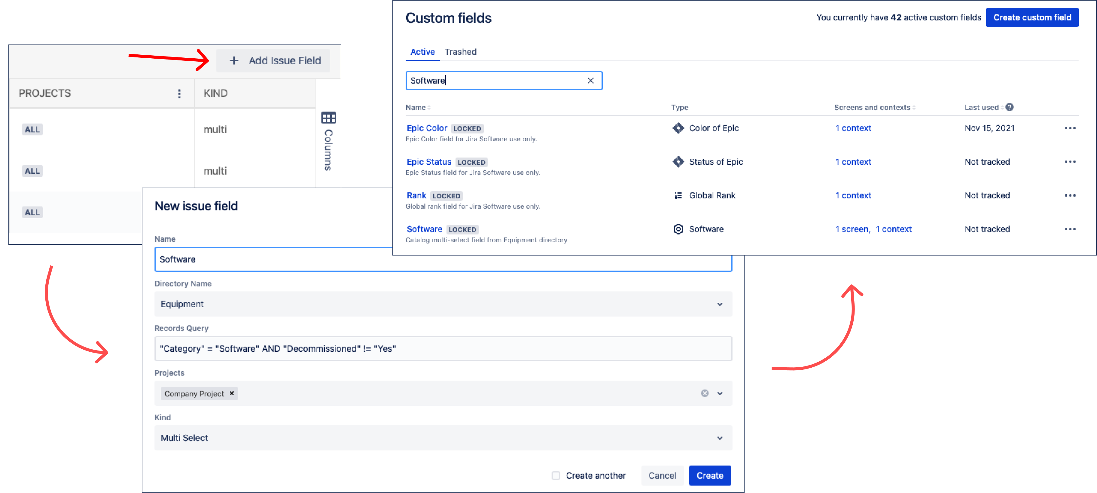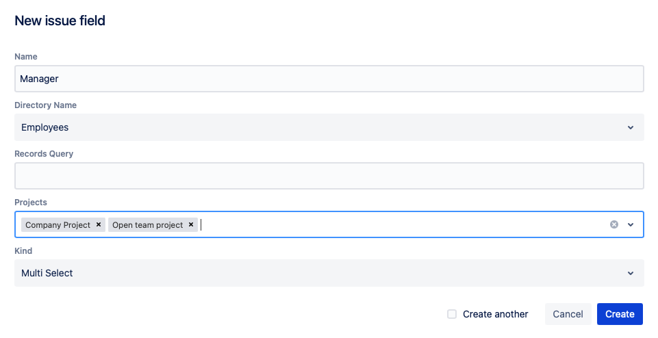The Universal Directories web-panel in issues will contain this field with the ability to access and manage objects there. Also, the synchronized custom field will be automatically added to the list of custom fields. This field should not necessarily be added to screens, it will be updated by the app by any changes in the relevant field of the web-panel.