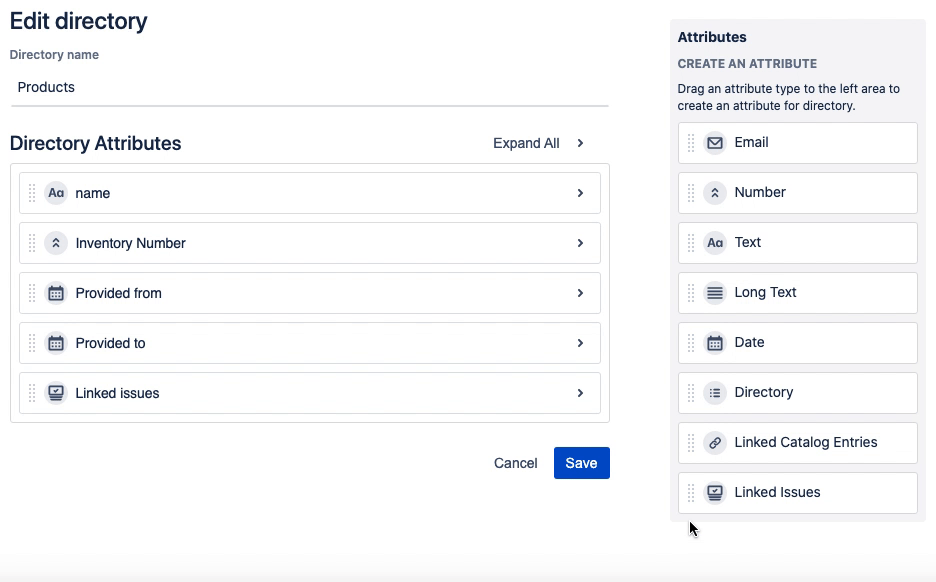 So this attribute is added by default. You cannot edit or delete it. Users will have to add entries with names unique within a directory.All other attributes are up to you. Create as many as you need and specify: