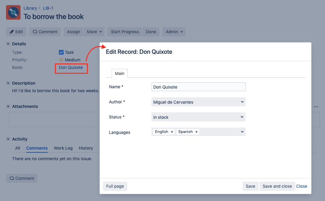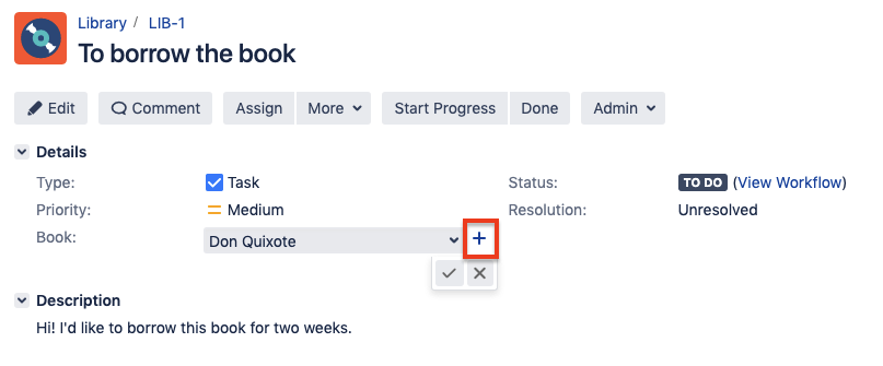 If you cannot find a required entry while selecting from custom field options, you can create a new entry right from the issue. ⚠ Note that the ability to create a new entry appears only when the field is active.