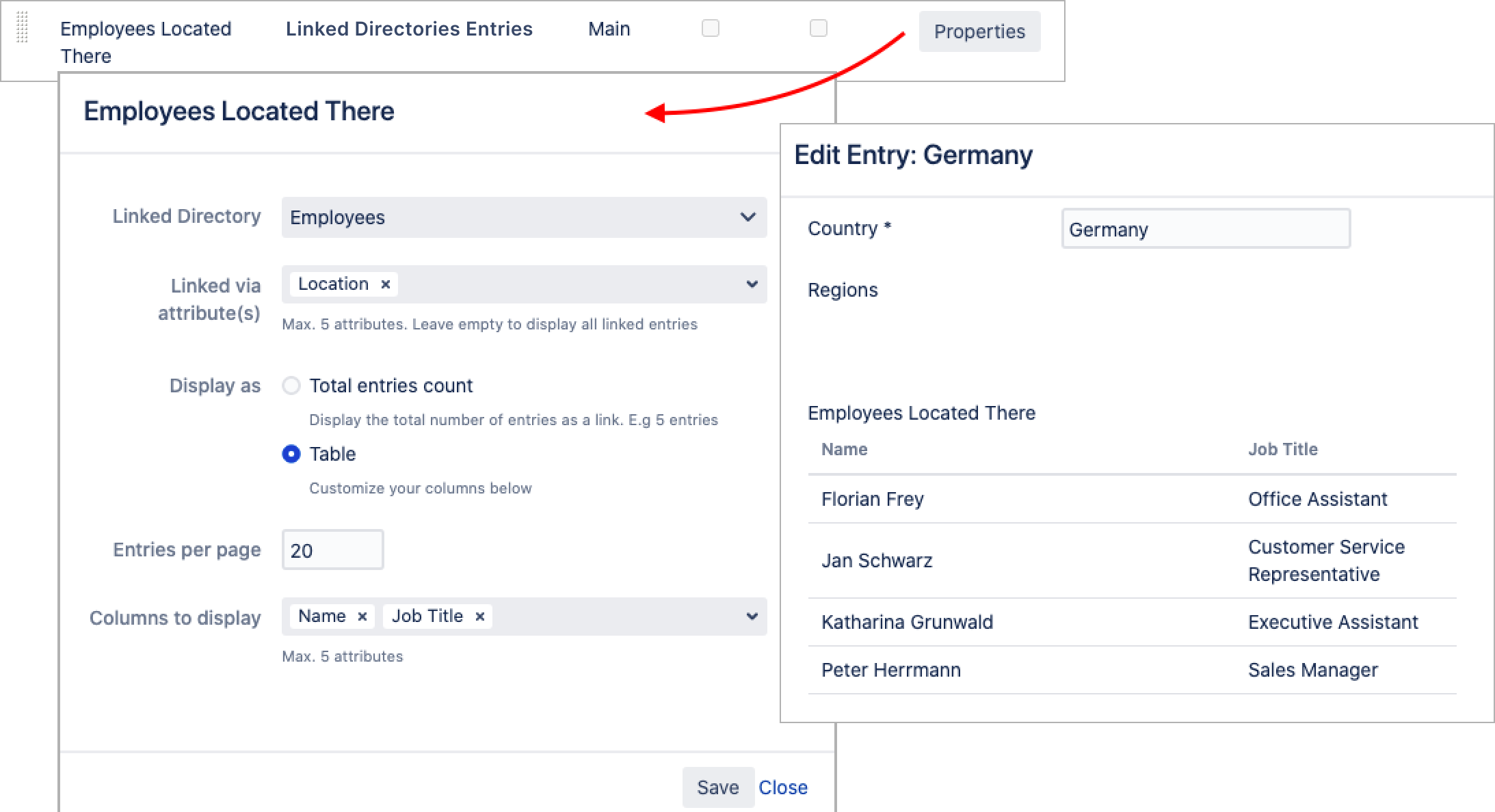 Step 2. Define if you need to get the statistics for a particular parameter. To display the list of employees within a country card navigate to the relevant template (country) and add the Linked Directories Entries attribute there with selecting employees as the target directory. You can add this attribute any time later, it will retrieve the information instantly.