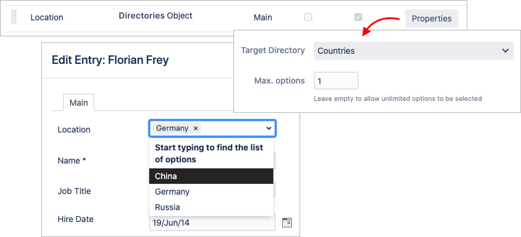 Step 1. Define the object (i.e. Employee) and add a Directories Object attribute to its template. Name it (i.e. Location) and select a directory as a target one for fetching options from (Countries). Your employee template now allows user to select locations from the list of countries. You can set the cardinality – how many entries can be selected. As for location, we will just allow selecting one entry, so there will be one country specified for an employee.