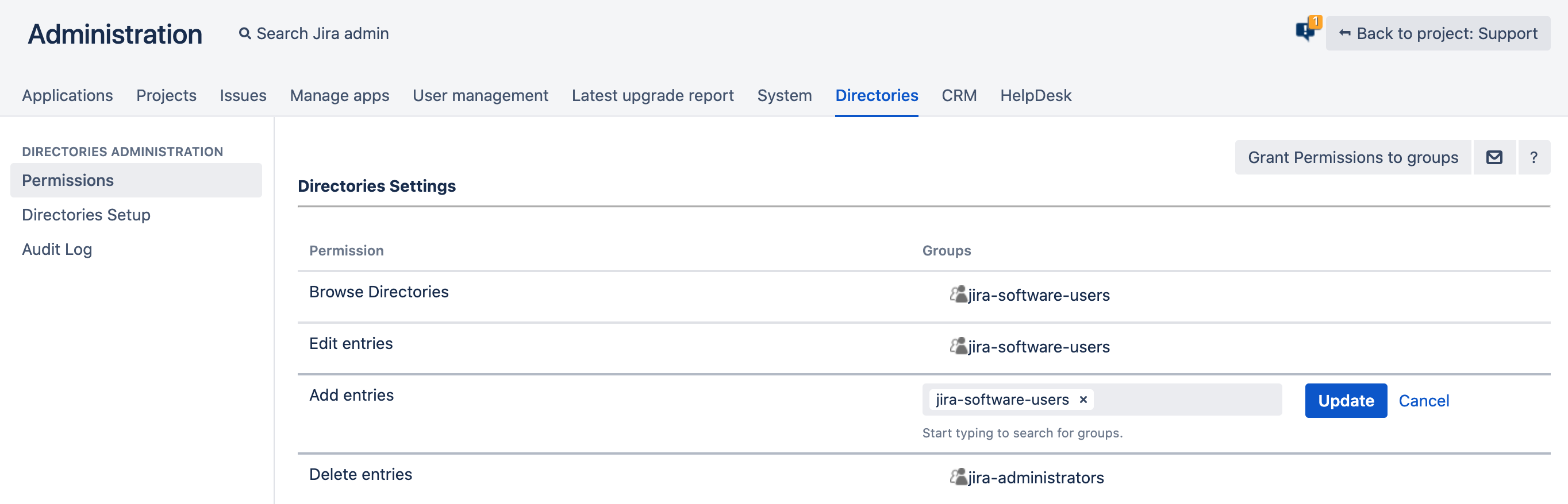Universal Directories permissions are mutual for the Directories Section and the Directories Select custom field(s). They are located in the Jira Administration → Directories section and include the following parameters: