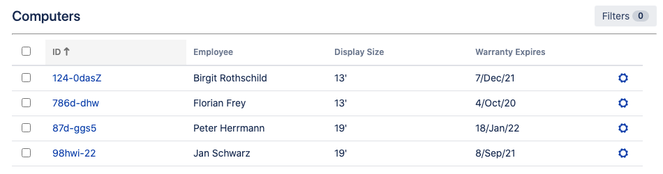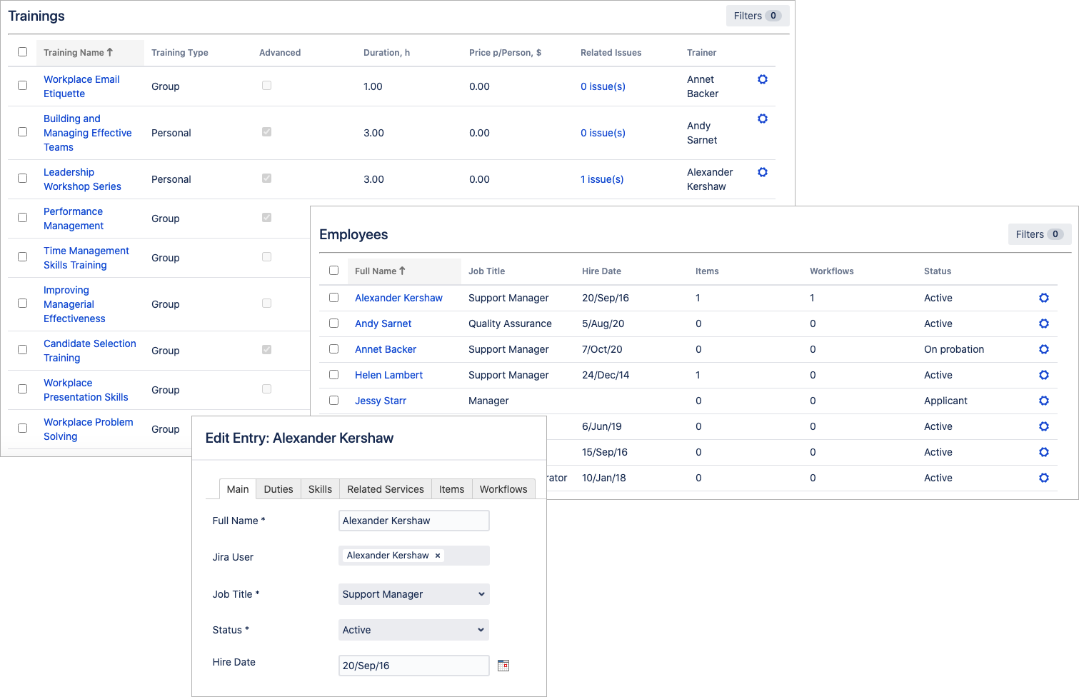 Store and structure the common HR data such as employee info, job titles, departments, locations, skills and others. Link information to be able to retrieve the particular data of interest. Use the powerful filtration to create a complex selection. Combine with a Jira workflow for a more clear vision of the onboarding process.