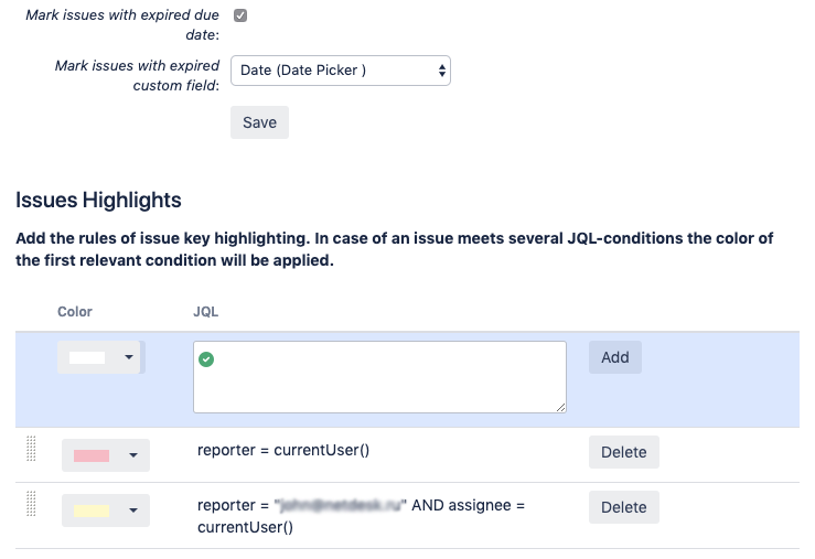 Specify what issues to be considered overdue and select the issue key area color for the particular JQL-case
